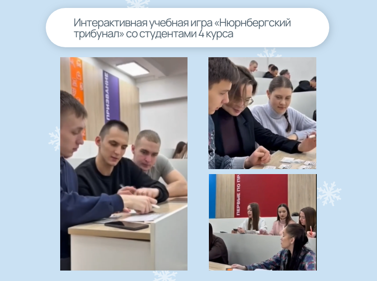 Современное образование требует внедрения инновационных подходов, способствующих повышению мотивации студентов и углублению их знаний. Для изучения дисциплины «Право международной безопасности» важно учитывать историю международных отношений. Интерактивная учебная игра «Нюрнбергский трибунал» со студентами 4 курса позволила воссоздать ретроспективу беспрецедентного события мировой истории и на практике изучить особенности материального и процессуального права трибуналов.